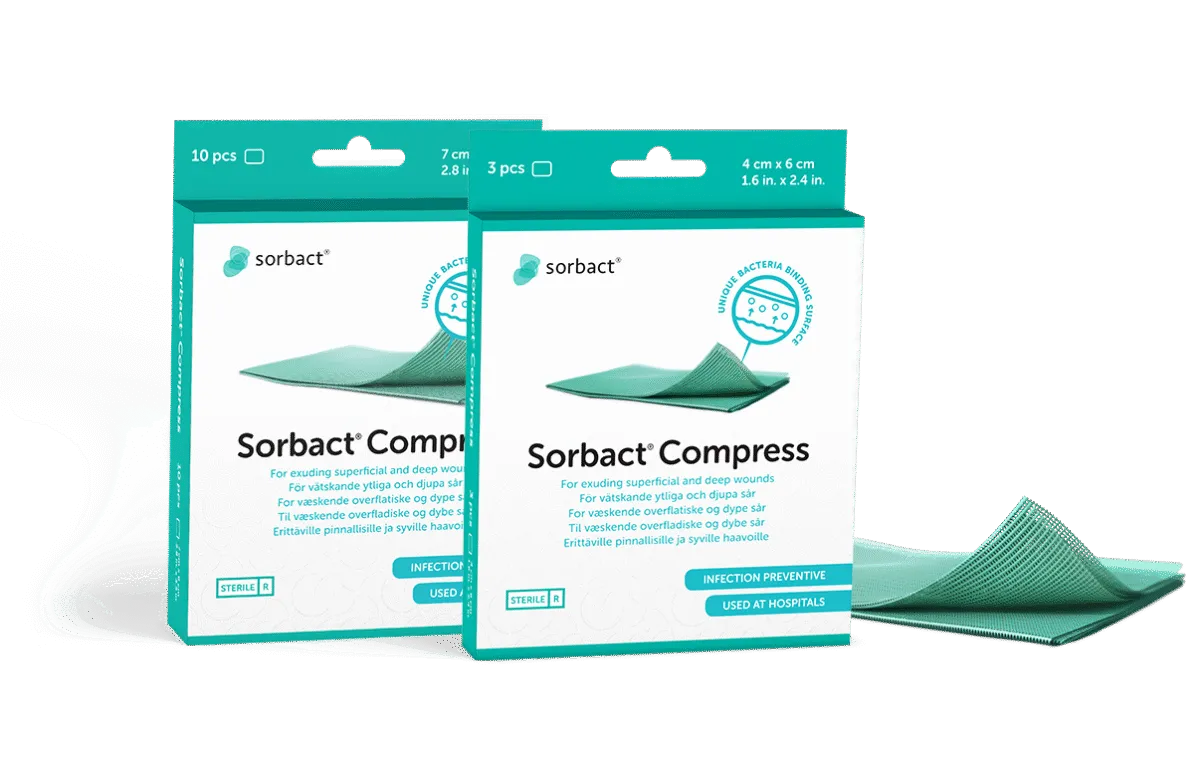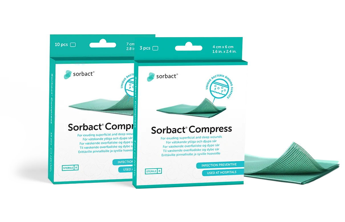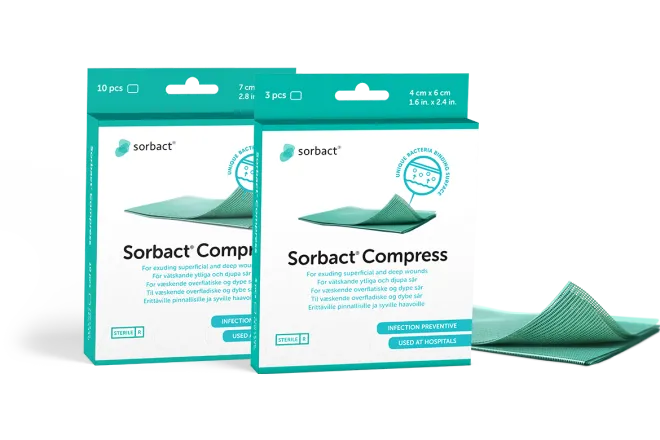 Sorbact Compress on steriili, bakteereja ja sieniä sitova haavasidos. Ainutlaatuinen Sorbact-pinta sitoo haavan bakteereita, mikä nopeuttaa haavan paranemista ja ehkäisee tulehduksia. Sorbact Compress on ei-imevä haavakontaktisidos kirurgisille ja akuuteille haavoille. Käytetään yhdessä imevän peittosidoksen kanssa. On tärkeää, että koko haava-alue peitetään Sorbact Compress -sidoksella parhaan hoitotuloksen saamiseksi.